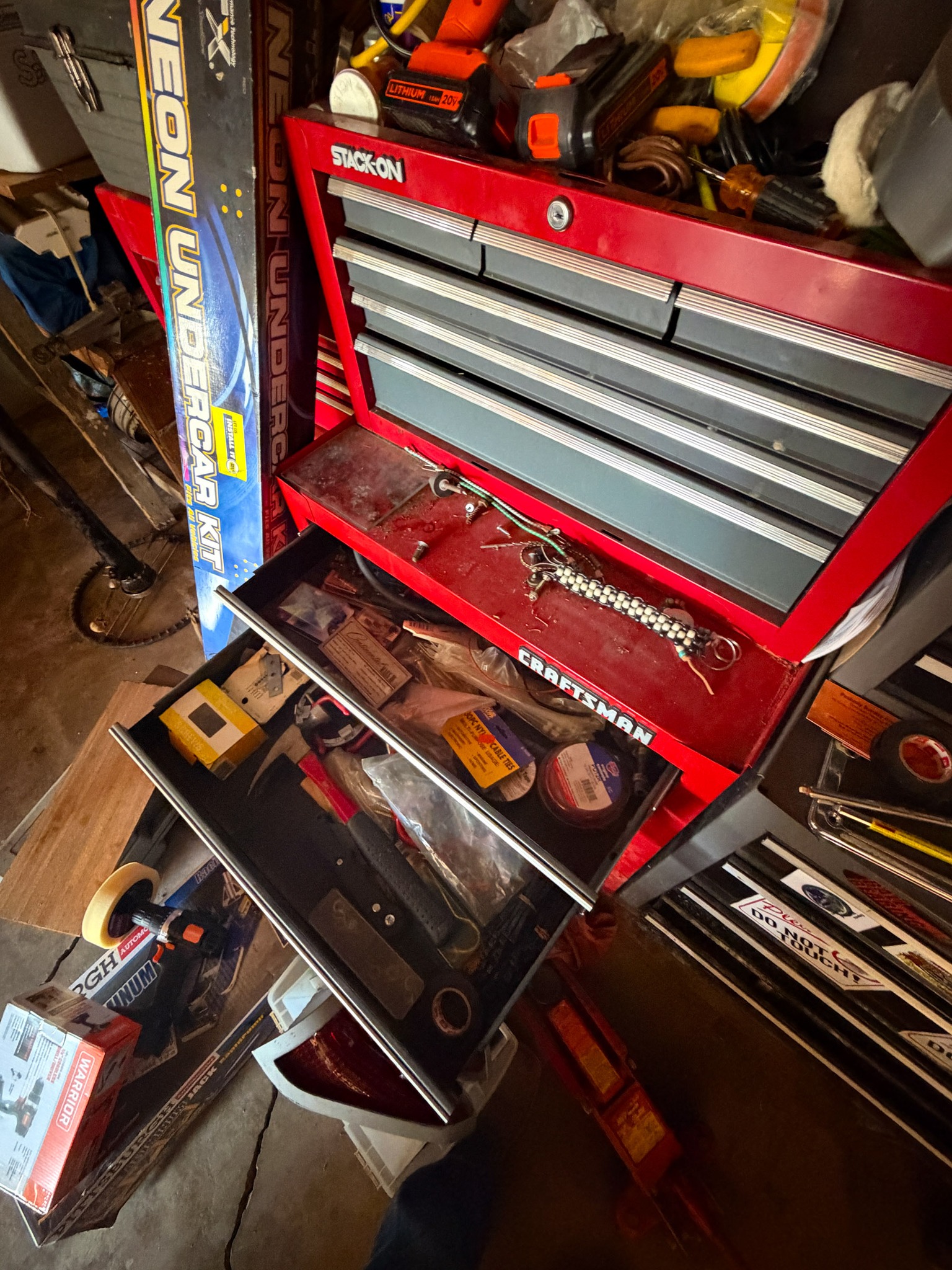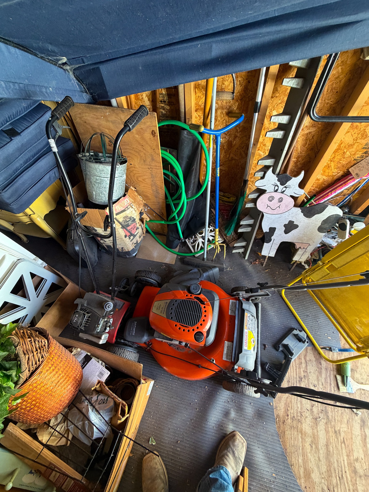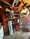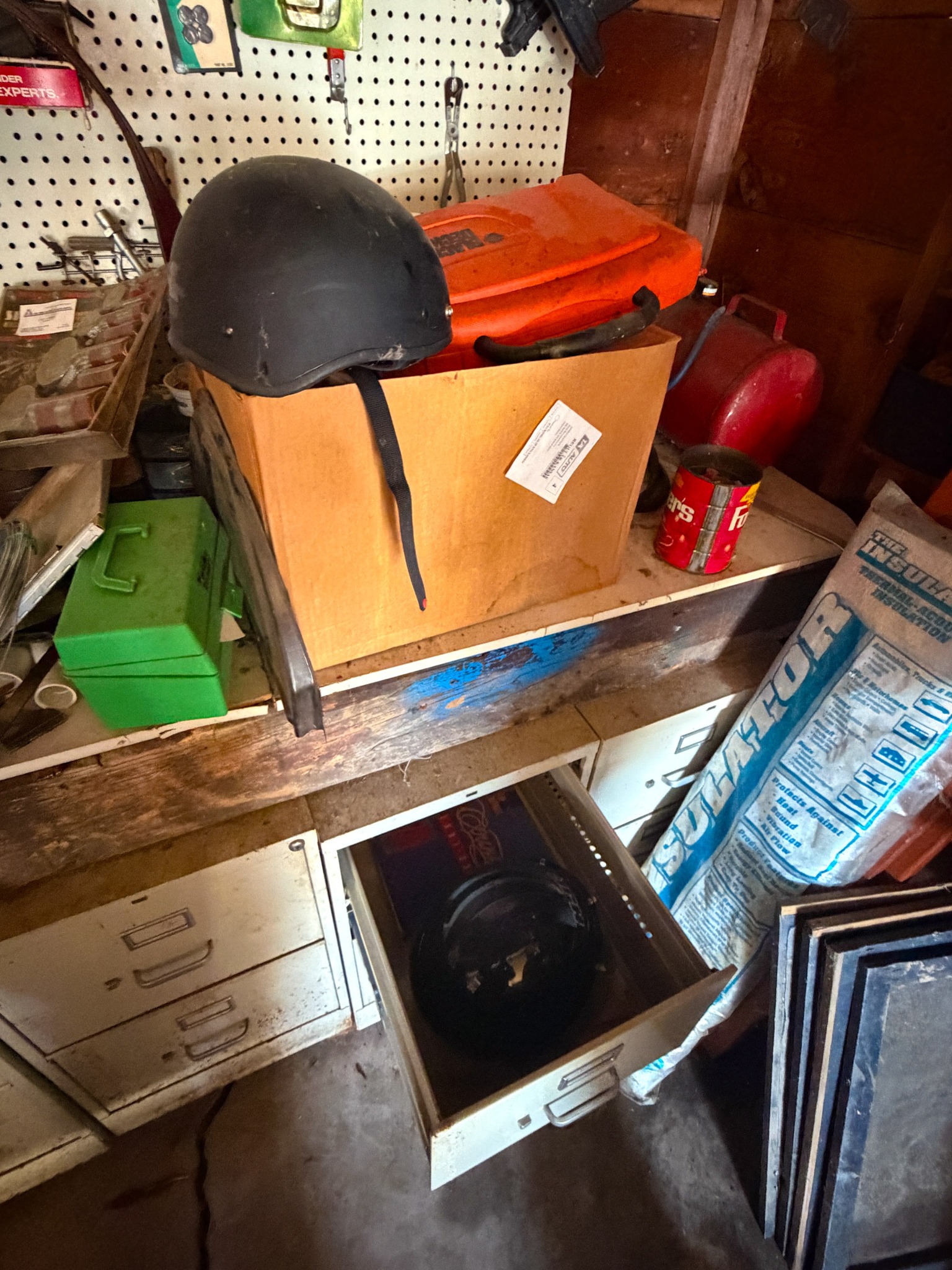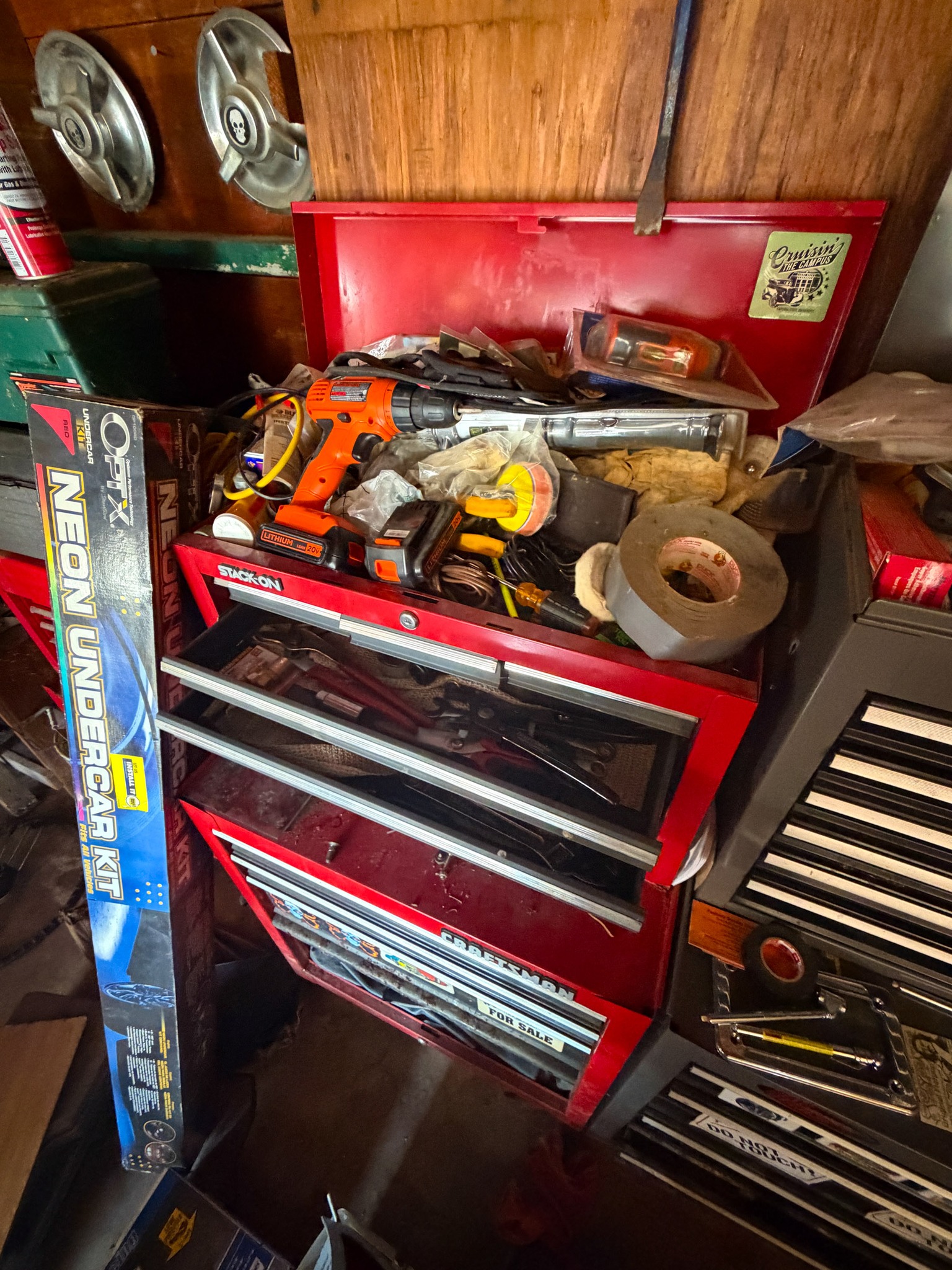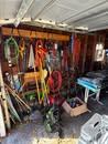 Tools & Outdoor: several roll around tool boxes, power tools, wrenches, socket sets, shop stools, shop cabinets, lanterns, coolers, Orange County chopper Bicycle (new in box), pole saw, outdoor furniture, small garden tiller, Husqvarna push mower, yard art, heaters, ladders, garden hoses, gas outdoor lights, outdoor metal glider, glider / swing w/ shade, gas grill, metal trellis, flower pots, yard tools, fishing rods & reels