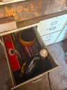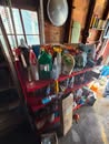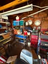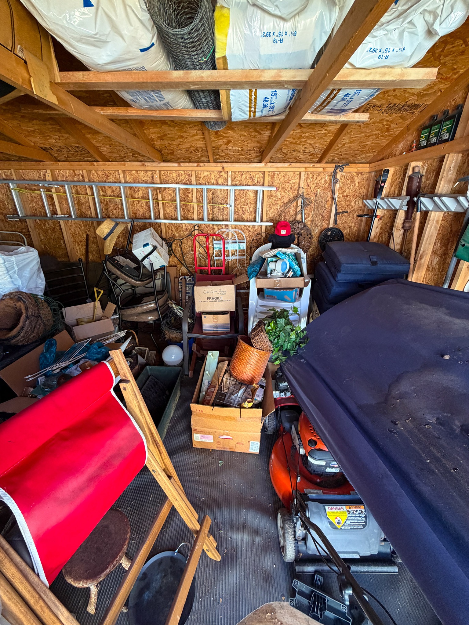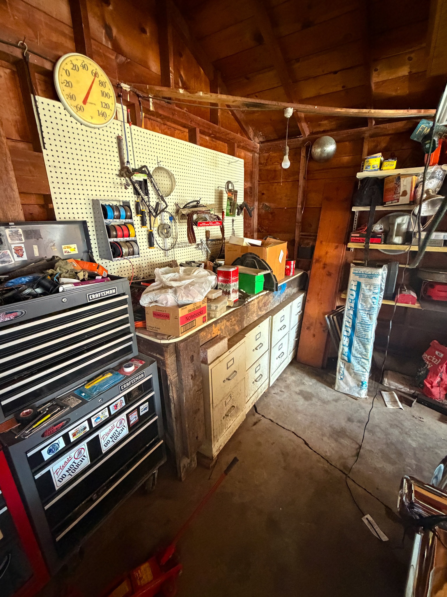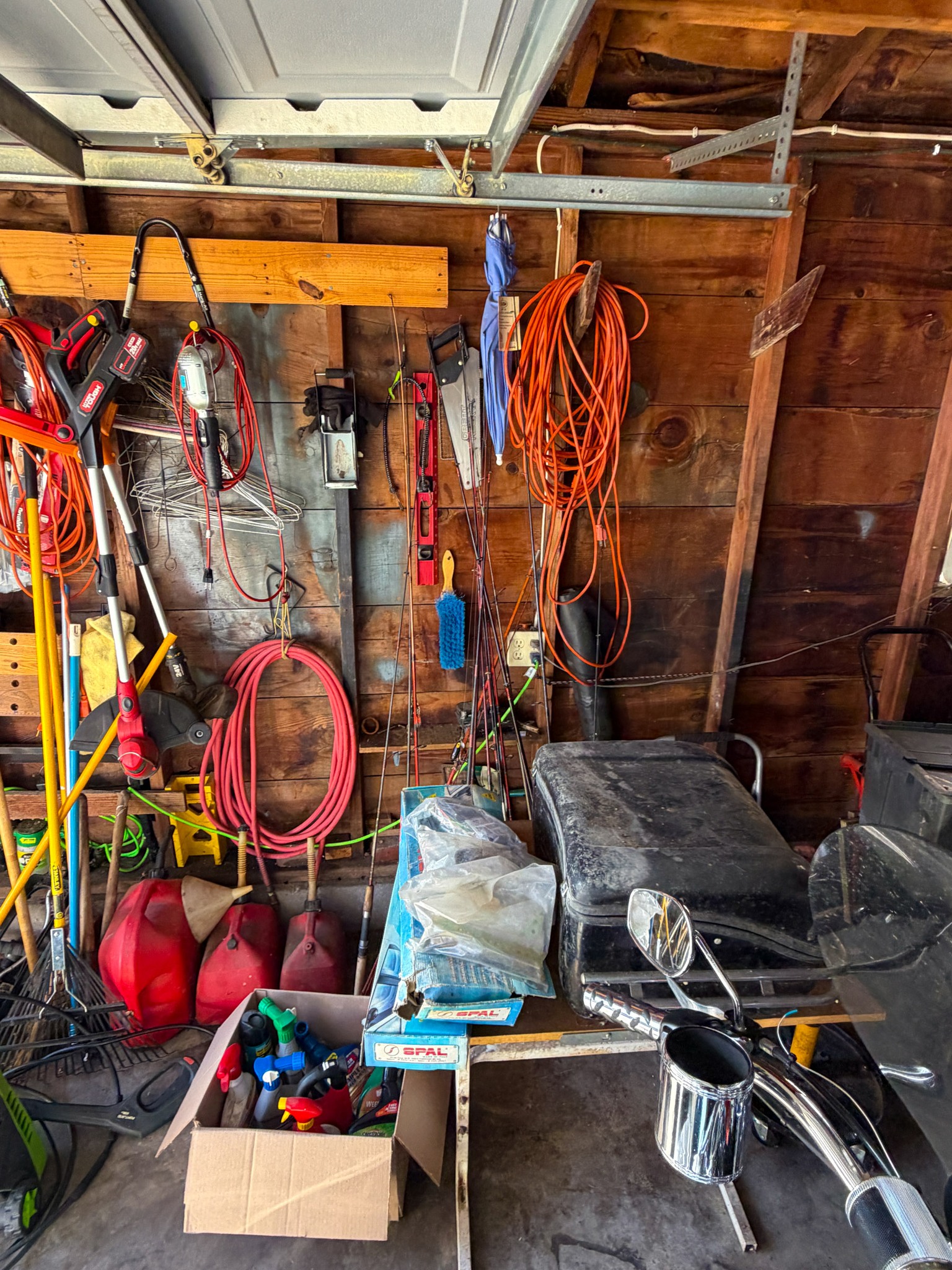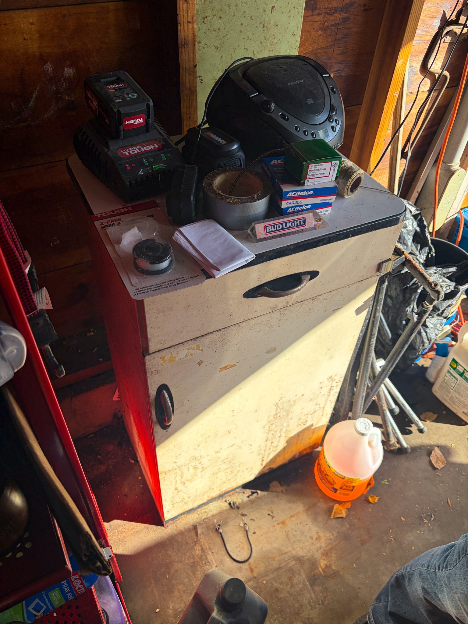 Tools & Outdoor: several roll around tool boxes, power tools, wrenches, socket sets, shop stools, shop cabinets, lanterns, coolers, Orange County chopper Bicycle (new in box), pole saw, outdoor furniture, small garden tiller, Husqvarna push mower, yard art, heaters, ladders, garden hoses, gas outdoor lights, outdoor metal glider, glider / swing w/ shade, gas grill, metal trellis, flower pots, yard tools, fishing rods & reels
