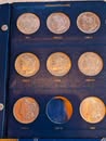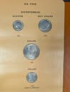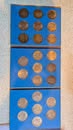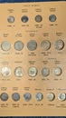Coin Books: Morgan Dollar 1892-1921 (missing 1893s & 1895) 42 coins silver, Peace Dollar 1921-1935 complete 24 coins silver, Franklin ½ Dollar 1948-1963 complete 36 coins silver, Washington Quarter 1948-1964 complete 40 coins silver, Roosevelt Dime 1946-1964 complete 50 coins silver. 3 coins US of A Dollar ½ Dollar and Quarter Silver. US Type Coin set complete 72 nice coins.