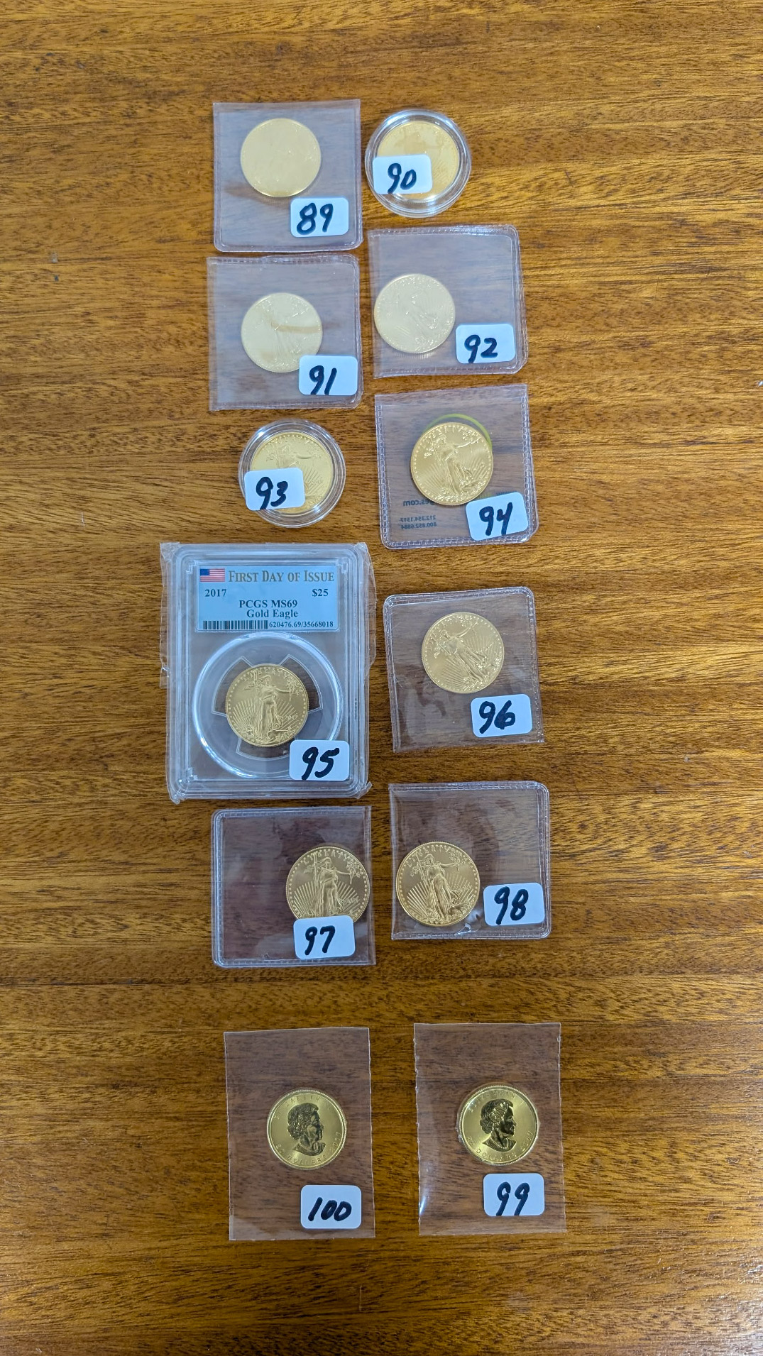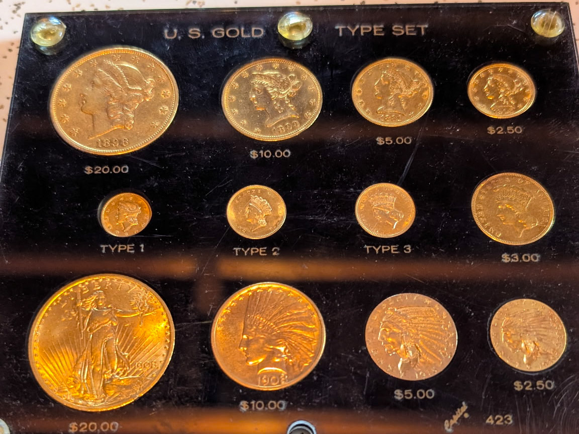 Gold: 175 pcs of Gold (60-70 ounces in 1oz, 1 / 2oz, 1 / 4oz, 1 / 10oz.), Gold Eagles, Gold Maple Leafs, Gold Australian Coins, Gold Krugerrands, Gold Jewelry, "US Gold Type Sets" (12pc) (11pc).