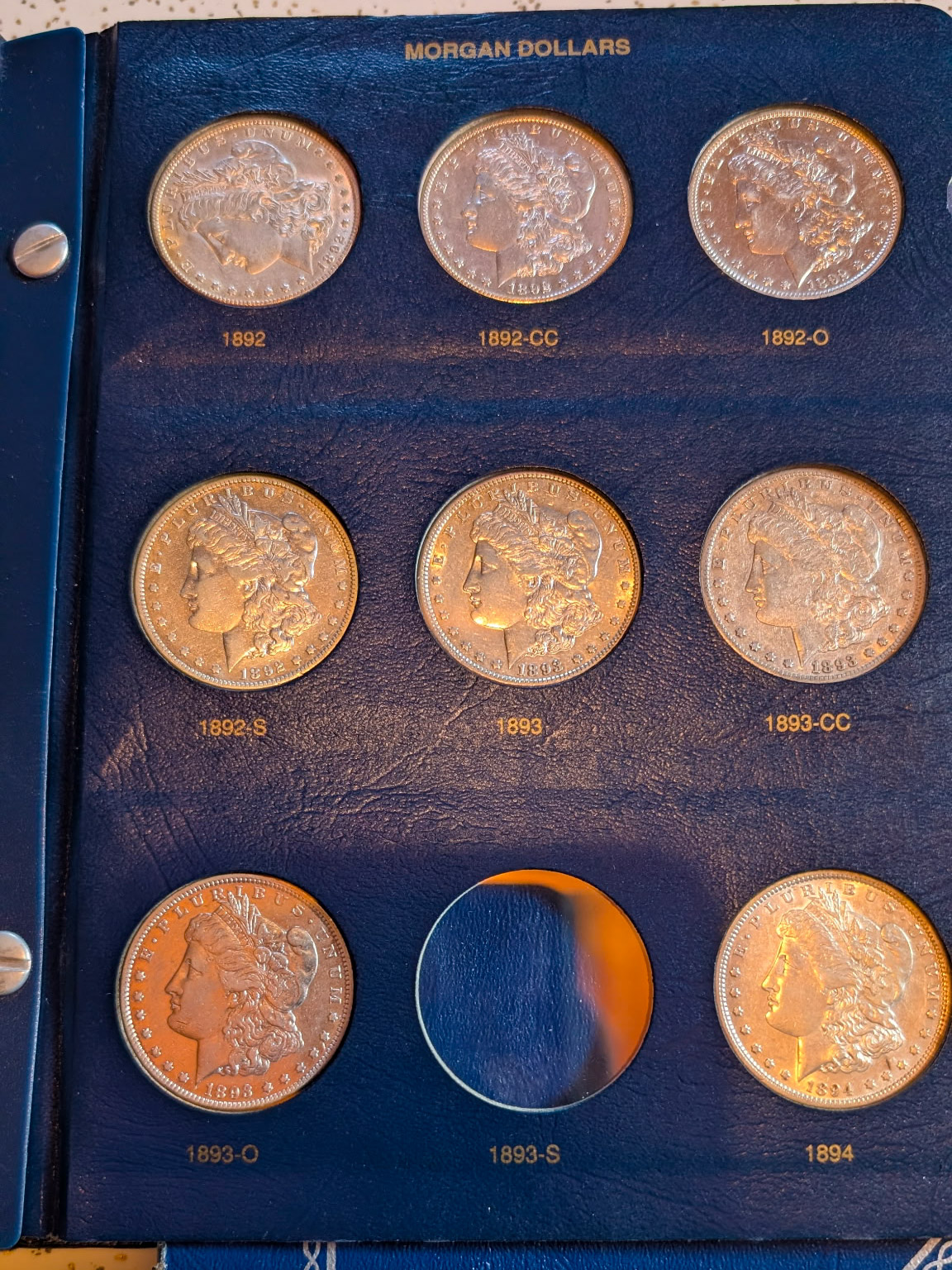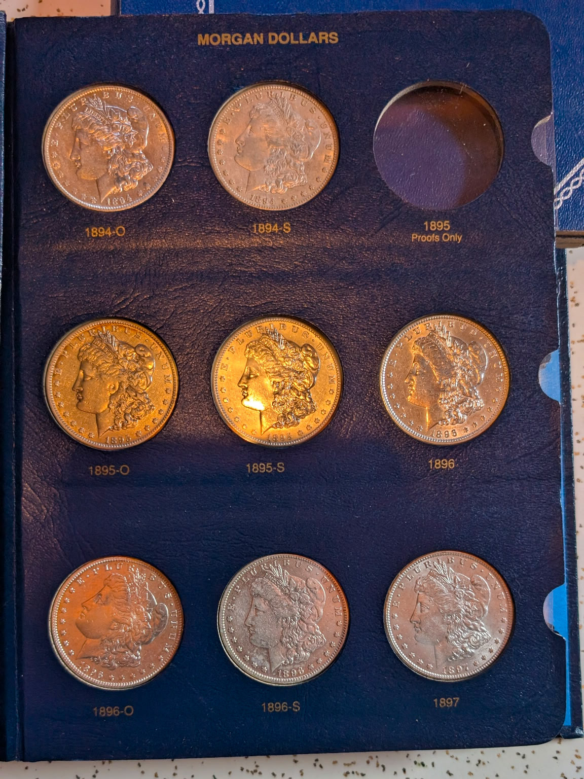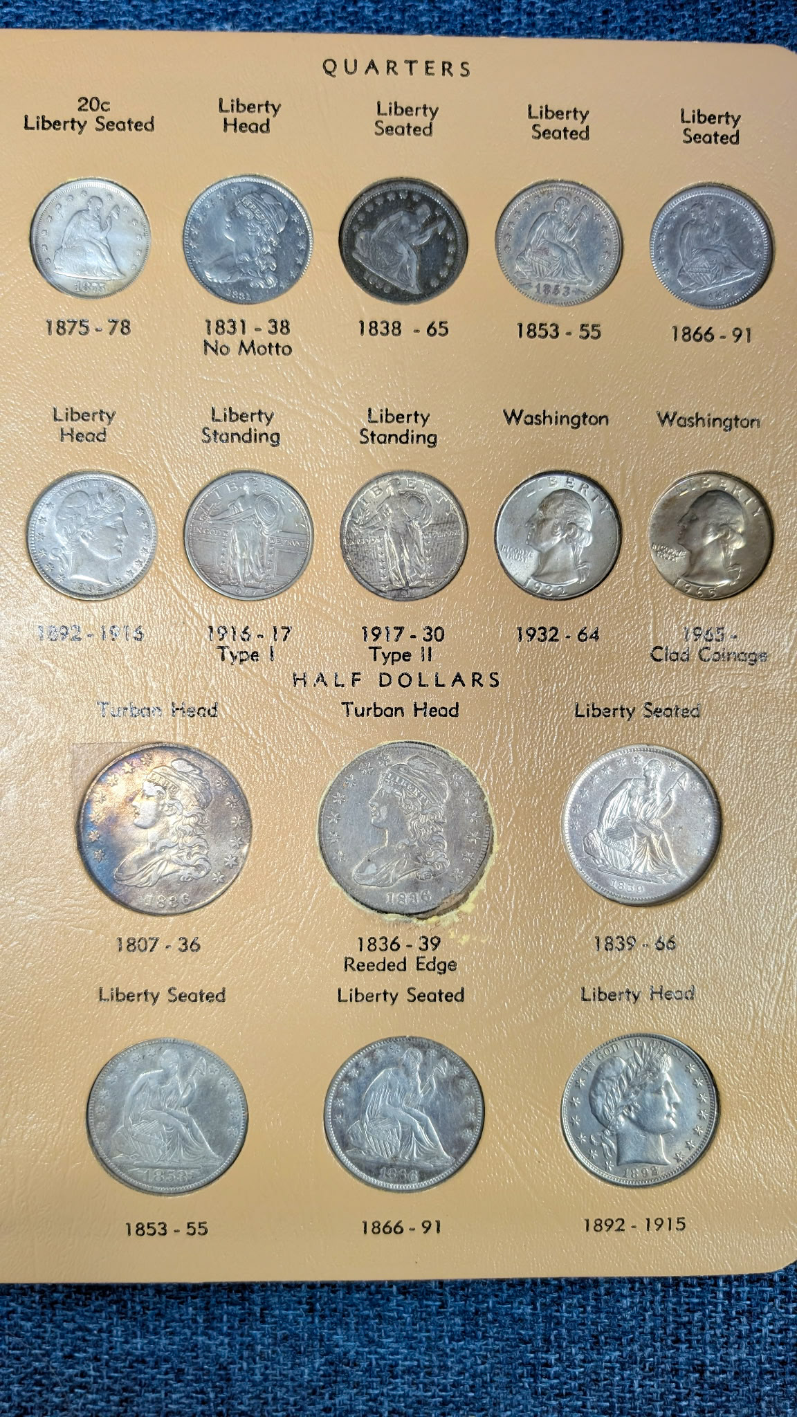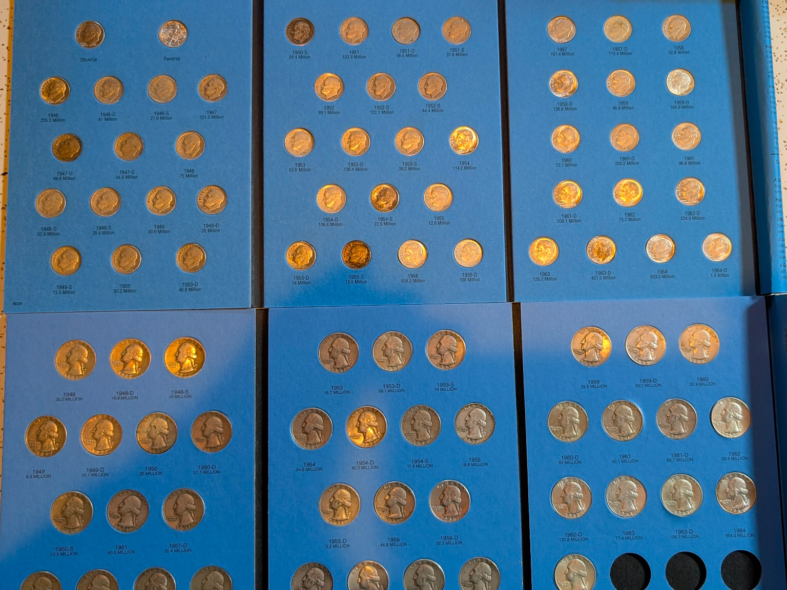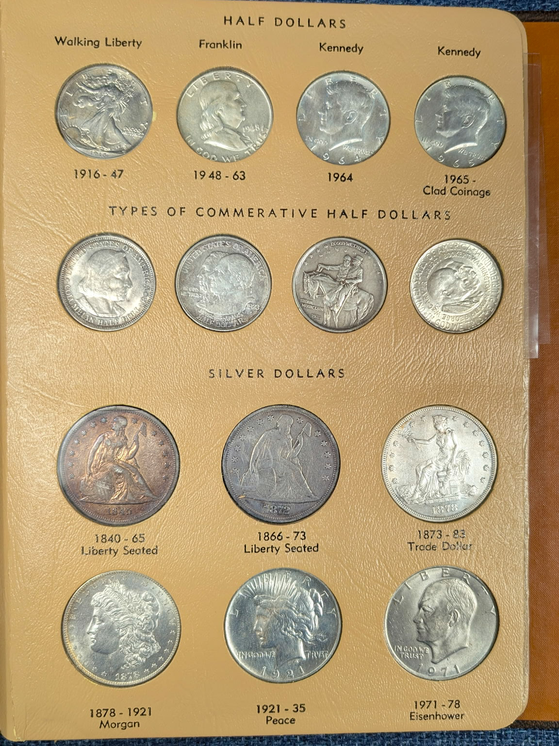 Coin Books: Morgan Dollar 1892-1921 (missing 1893s & 1895) 42 coins silver, Peace Dollar 1921-1935 complete 24 coins silver, Franklin ½ Dollar 1948-1963 complete 36 coins silver, Washington Quarter 1948-1964 complete 40 coins silver, Roosevelt Dime 1946-1964 complete 50 coins silver. 3 coins US of A Dollar ½ Dollar and Quarter Silver. US Type Coin set complete 72 nice coins.