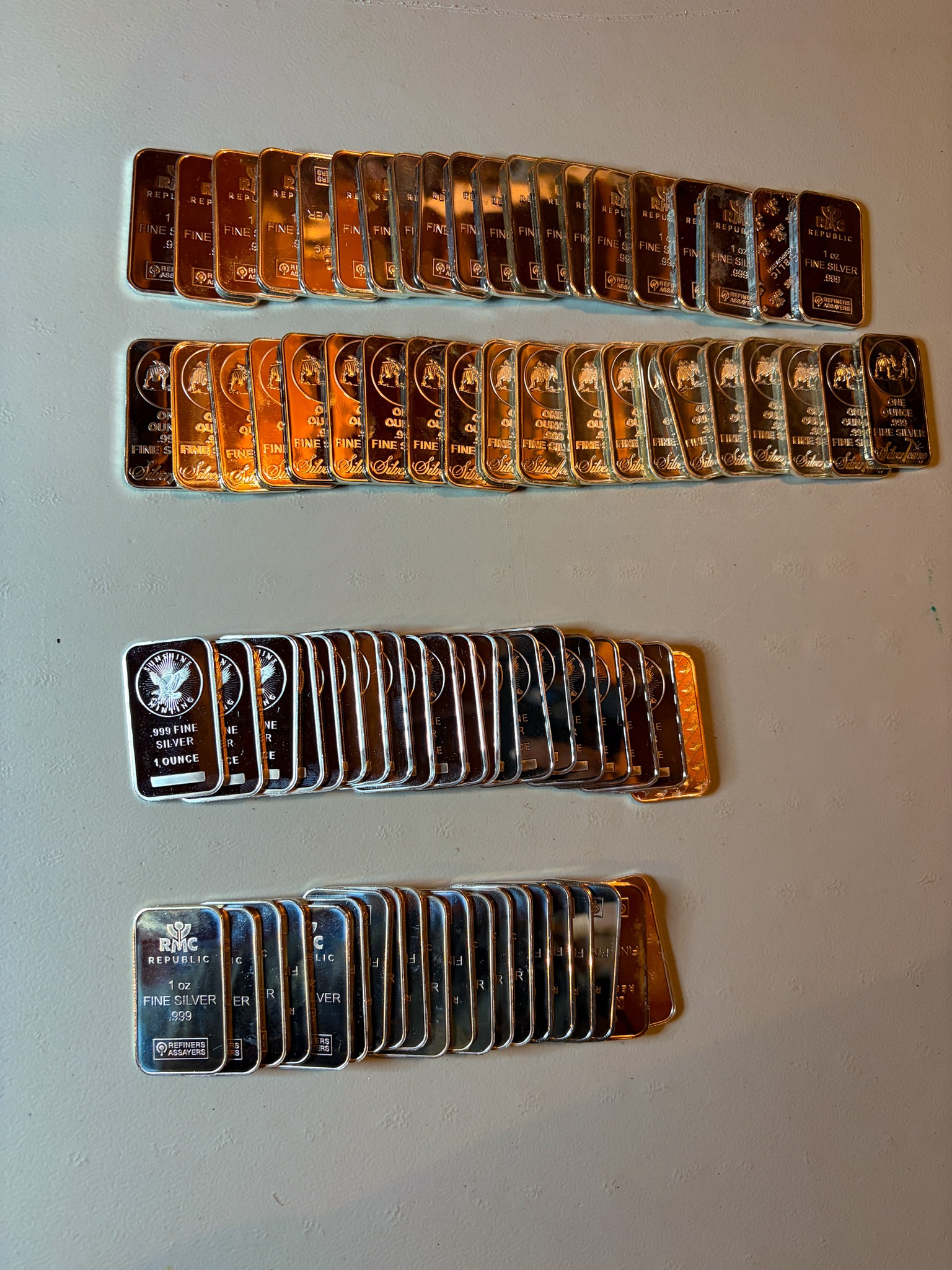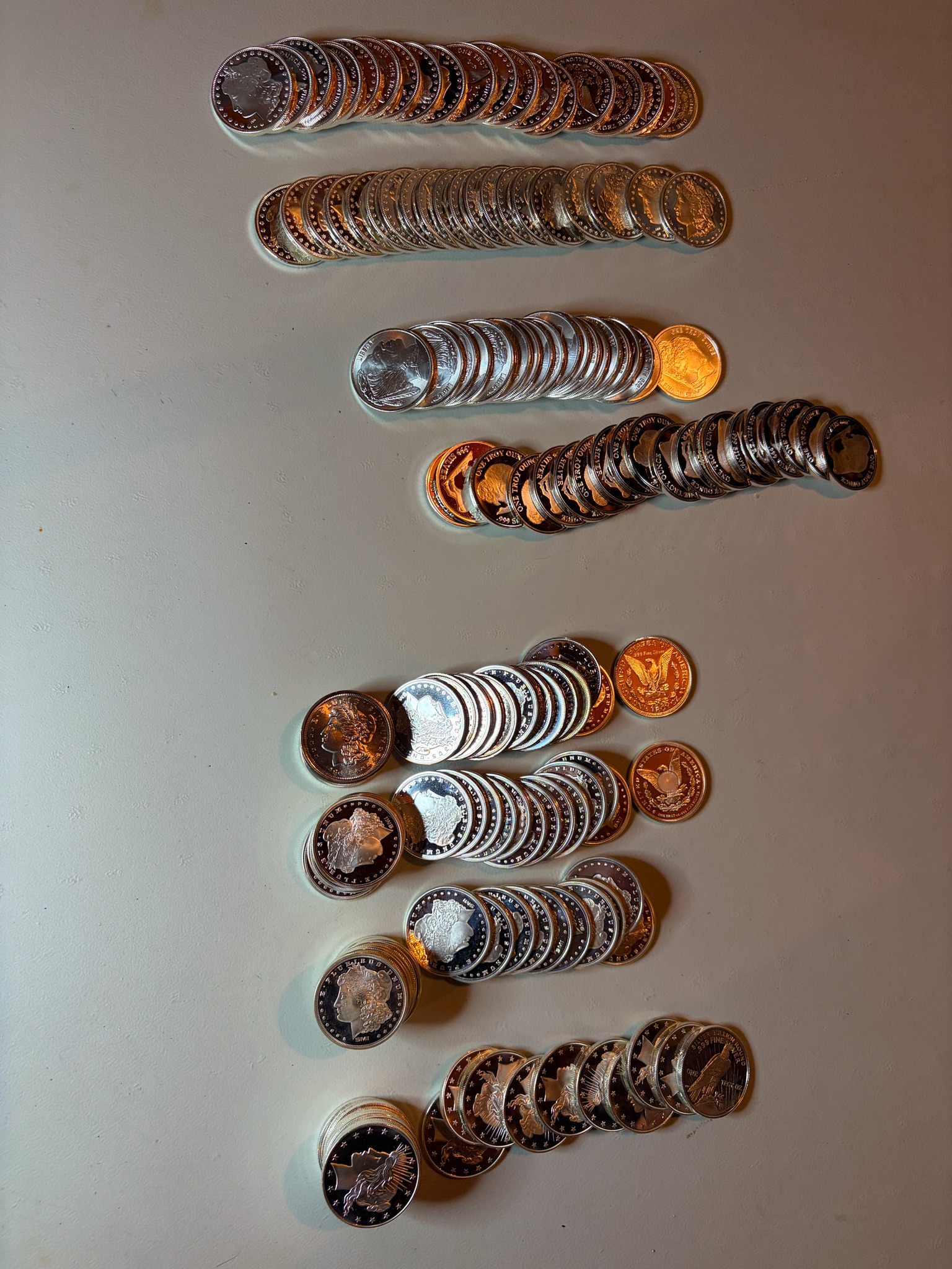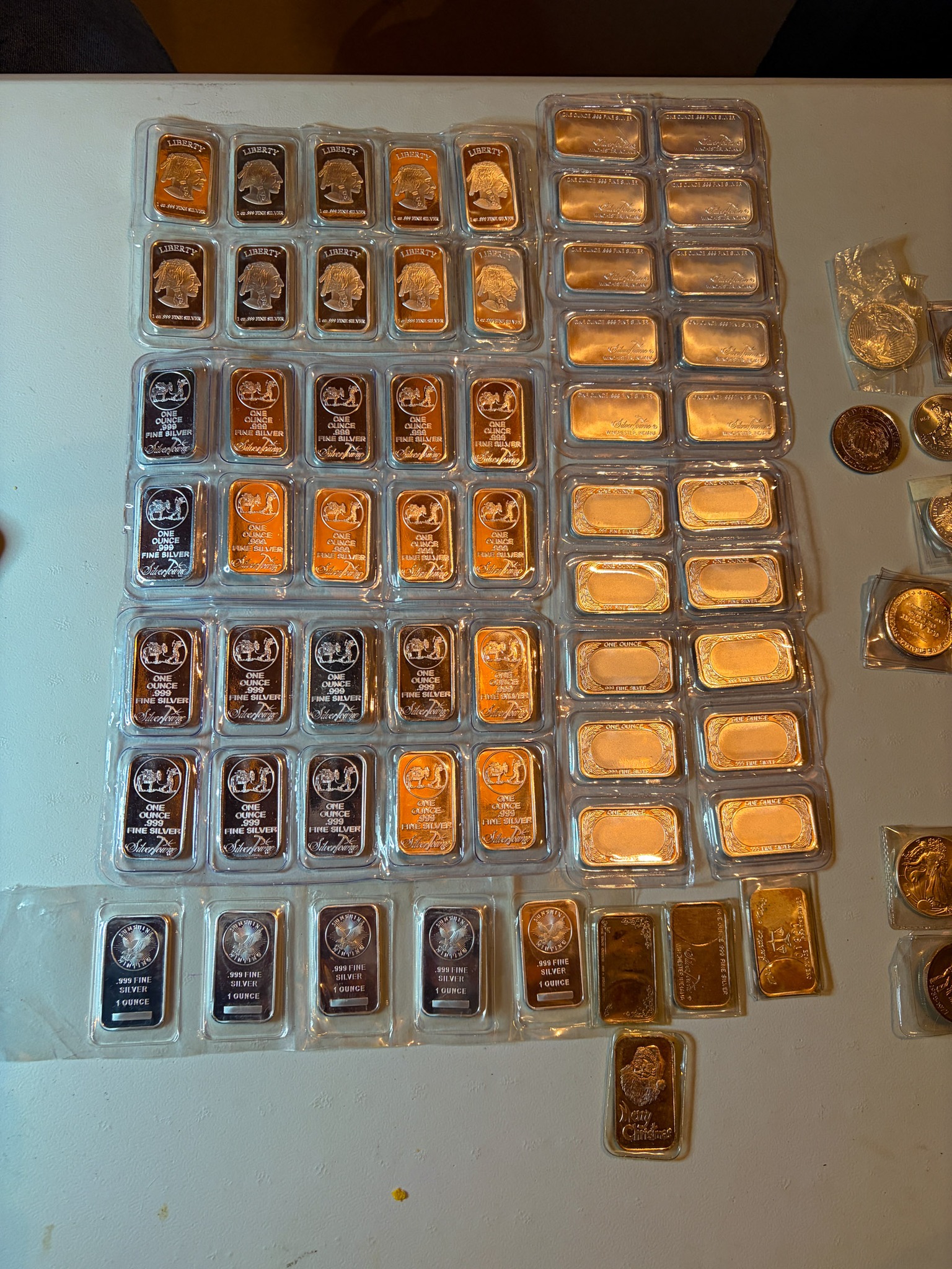 Silver: 575 ounces of .999silver 5oz& 1oz bars & rounds, Silver Eagles, 71 ounces 92.5 sterling silver bars, 1,033 quarters 90% silver $258.25 Face Value, 1,557 Dimes 90% silver $155.70 face value, .999 silver medallions / sterling medallions silver dollars, silver ½ dollars, quarters, dimes, nickels