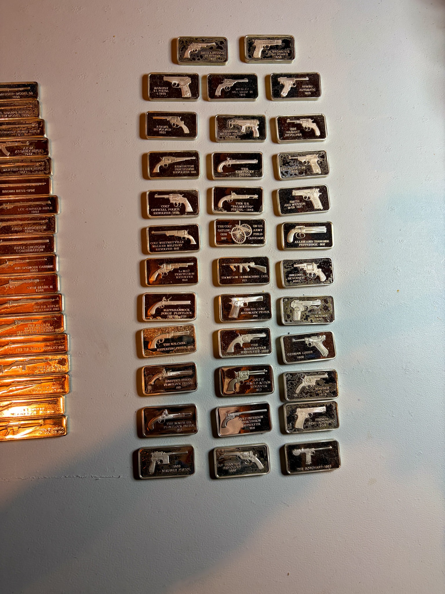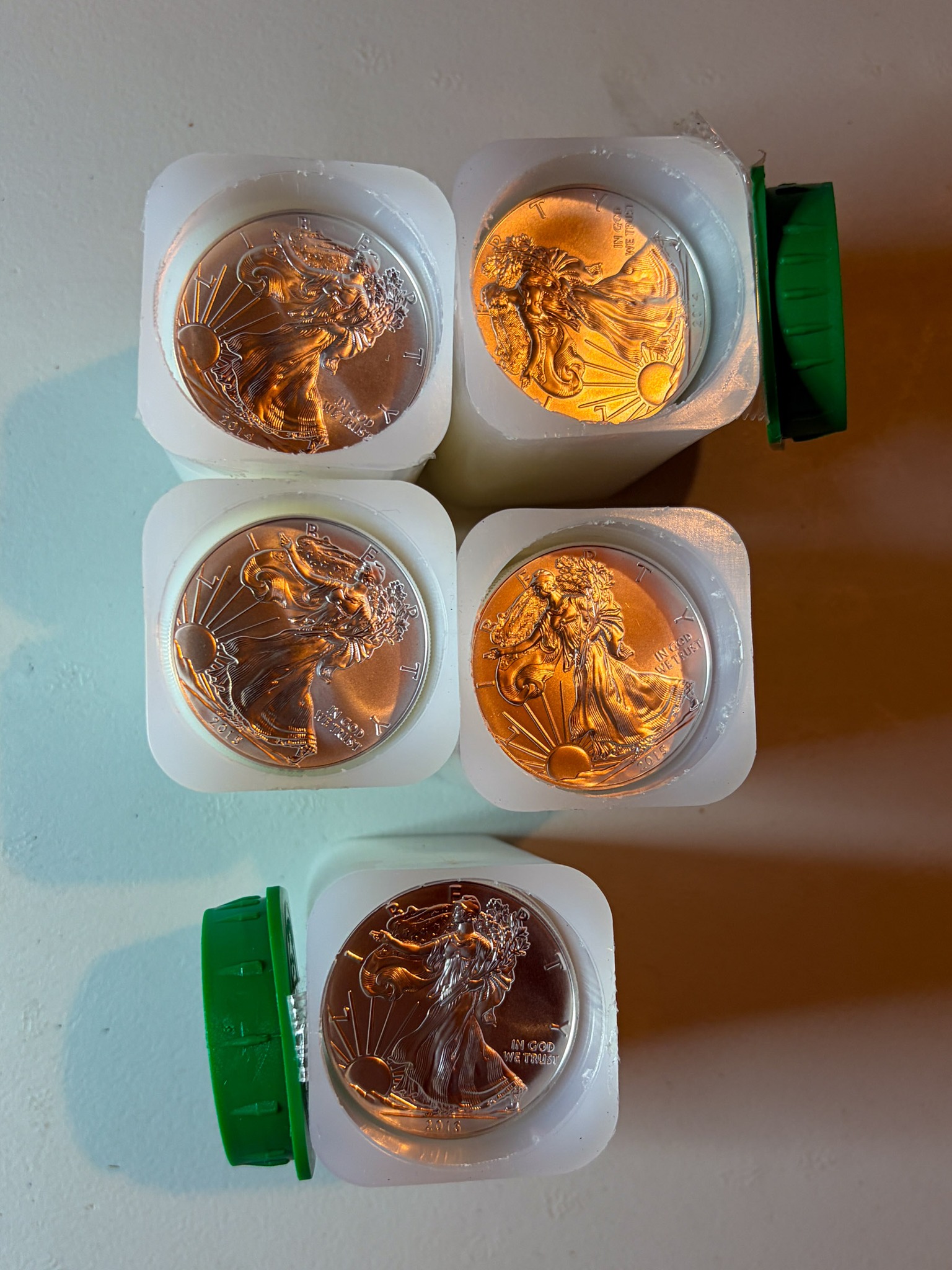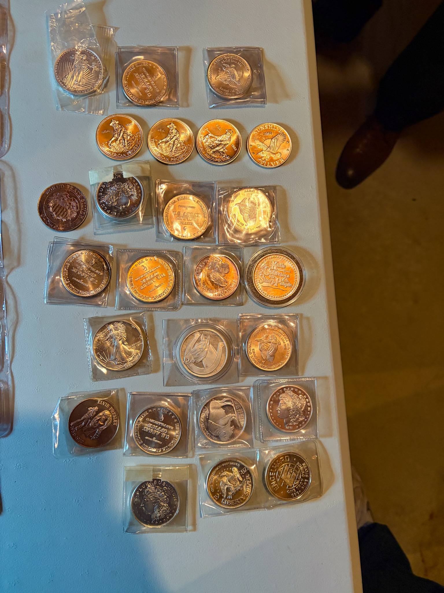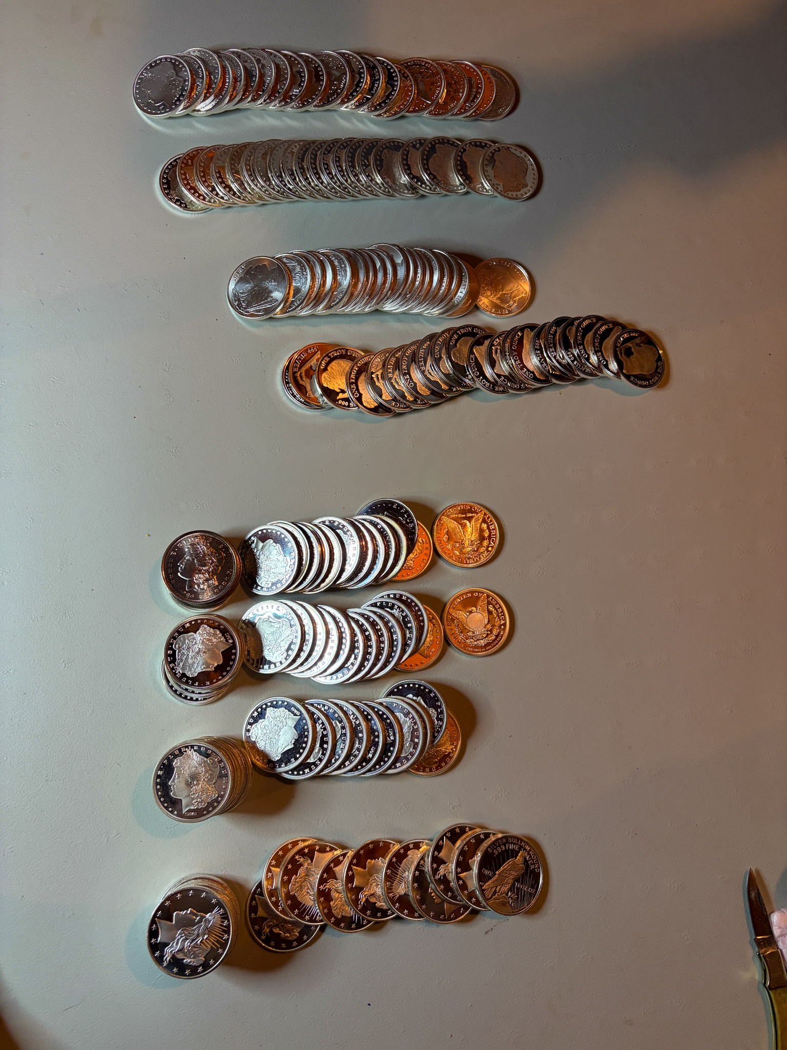 Silver: 575 ounces of .999silver 5oz& 1oz bars & rounds, Silver Eagles, 71 ounces 92.5 sterling silver bars, 1,033 quarters 90% silver $258.25 Face Value, 1,557 Dimes 90% silver $155.70 face value, .999 silver medallions / sterling medallions silver dollars, silver ½ dollars, quarters, dimes, nickels